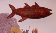 In the San Blas, the Kuna indians haven't changed much for hundreds of years. They make long strings of beads, which are then wrapped intricately around wrists or ankles to make beautiful patterns such as animals or spirals. They make intricately sewn panel called "molas" for their blouses. And they make their boats out of burnt logs. They call them "ulus". Mom bought a carved wooden fish for $5. He is a carving of a Little Tunny and we have him mounted on the wall in Zora. He is so cool!