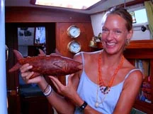 We left there to go to another deserted island. This island had no hermies (hermit crabs) but it did have Yellowtail Snapper! These usually small fish has wonderfully sweet flesh and very small mouths. We caught two very large ones of this fish and a pretty good sized mutton snapper that bit Mom. We left there to go to the island where Granny and Uncle Chris were meeting us. Granny stayed on the island that had a "hotel". These hotel rooms were packed dirt floor, bamboo walls, and palm frond roofs. Uncle Chris slept on the boat. We had Christmas on our boat with them. Granny and I made palm frond fish ornaments for the Christmas tree (which was tinsel.)