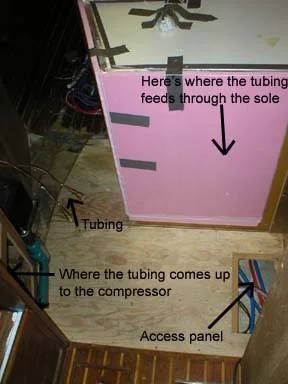 Feeding the tubing into the hole sawn in the 6" of foam under the box, through the sole, under the sole (with only some very inconveniently placed access panels to reach into, and up under the nav desk where the compressor lives- all without damaging or kinking the tubing- was not easy.