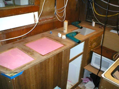 Next Neil installed the white Formica on the countertop. It'll be on the backsplash as well. Now we're finalizing the design of the dish and food storage lockers to go behind the stove and over the counter. Last weekend we mocked it up out of cardboard ( a COLD job since we're too far away from the electrical outlet to run our heater on board!) and, hopefully, Neil will soon be building some of the pieces: