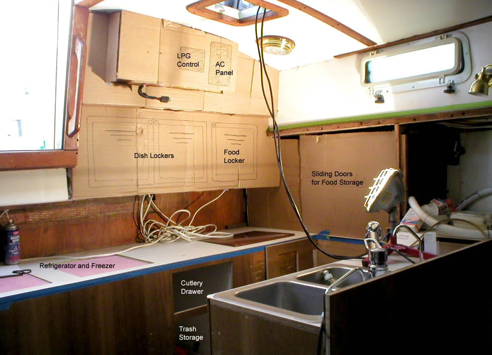 The view of the whole counter. The stove will go where the microwave is sitting (we won't have a microwave). The bin against the hull is dry storage, with a cutlery drawer and trash locker between it and the refrigerator: