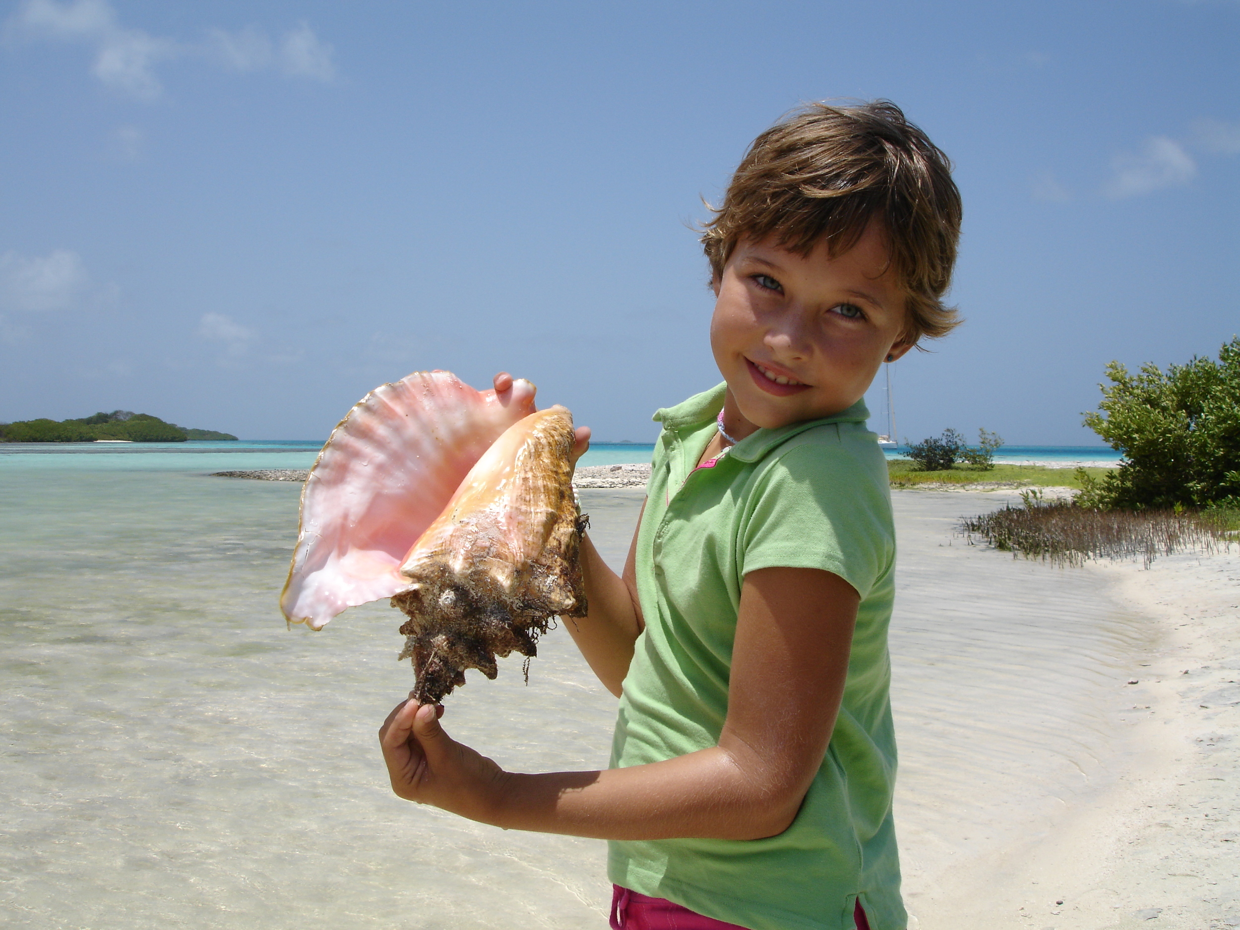 In the Aves de Barlovento, we spent a few nights in a protected mangrove anchorage that is a bird hatchery. Thousands and thousands of brown- and red-footed-boobies, as well as noddies, herons, pelicans, and frigatebirds nest on the island. We were able to dinghy right by nesting birds. Liv and I spent a few evenings trolling along the edge of the mangroves in the dinghy, and she landed some delicious Mangrove Snappers! Yum! We found a tiny half-hidden beach to pull the dinghy up under the trees, and found a path to explore the island. The windward side was completely different from inside the reef, wild and windy. We found bird nests, eggshells, and skeletons.